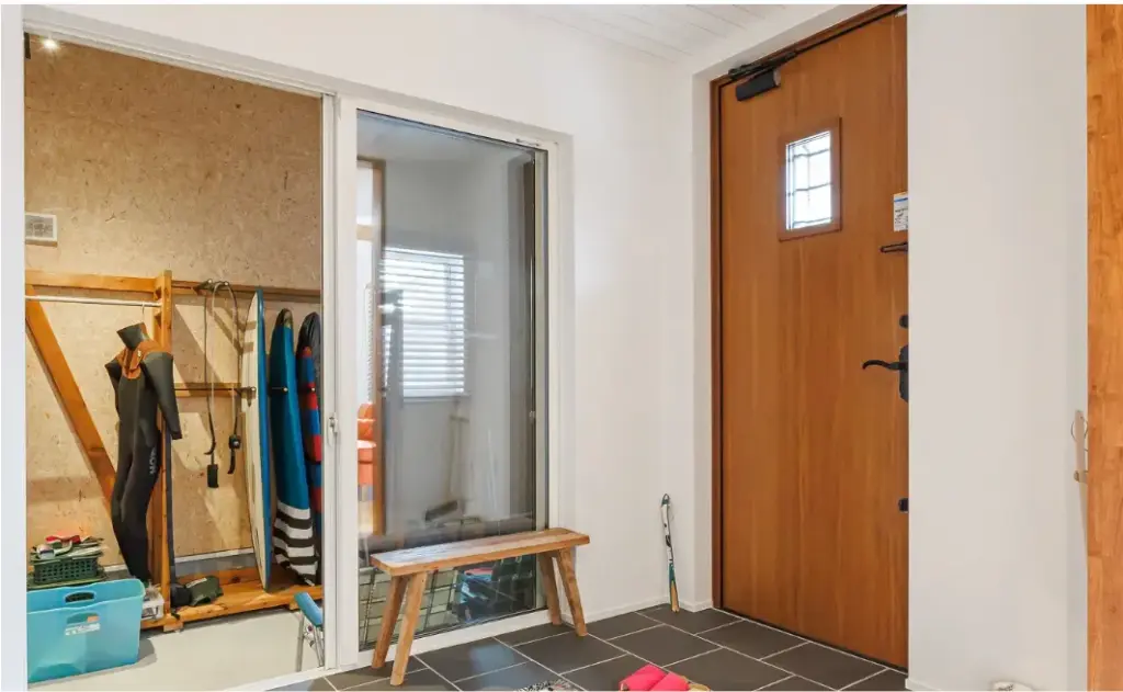 玄関から土間、ガレージへとシームレスにつながる空間は、サーフィン後の動線にも配慮され、リビングからお気に入りのサーフボードを眺められる点も大きな魅力。